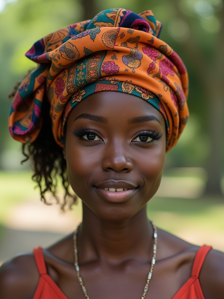 model wearing a colorful silk hair scarf fully covering the hair in a traditional wrapped style, with face-framing wisps , natural outdoor lighting in a park setting