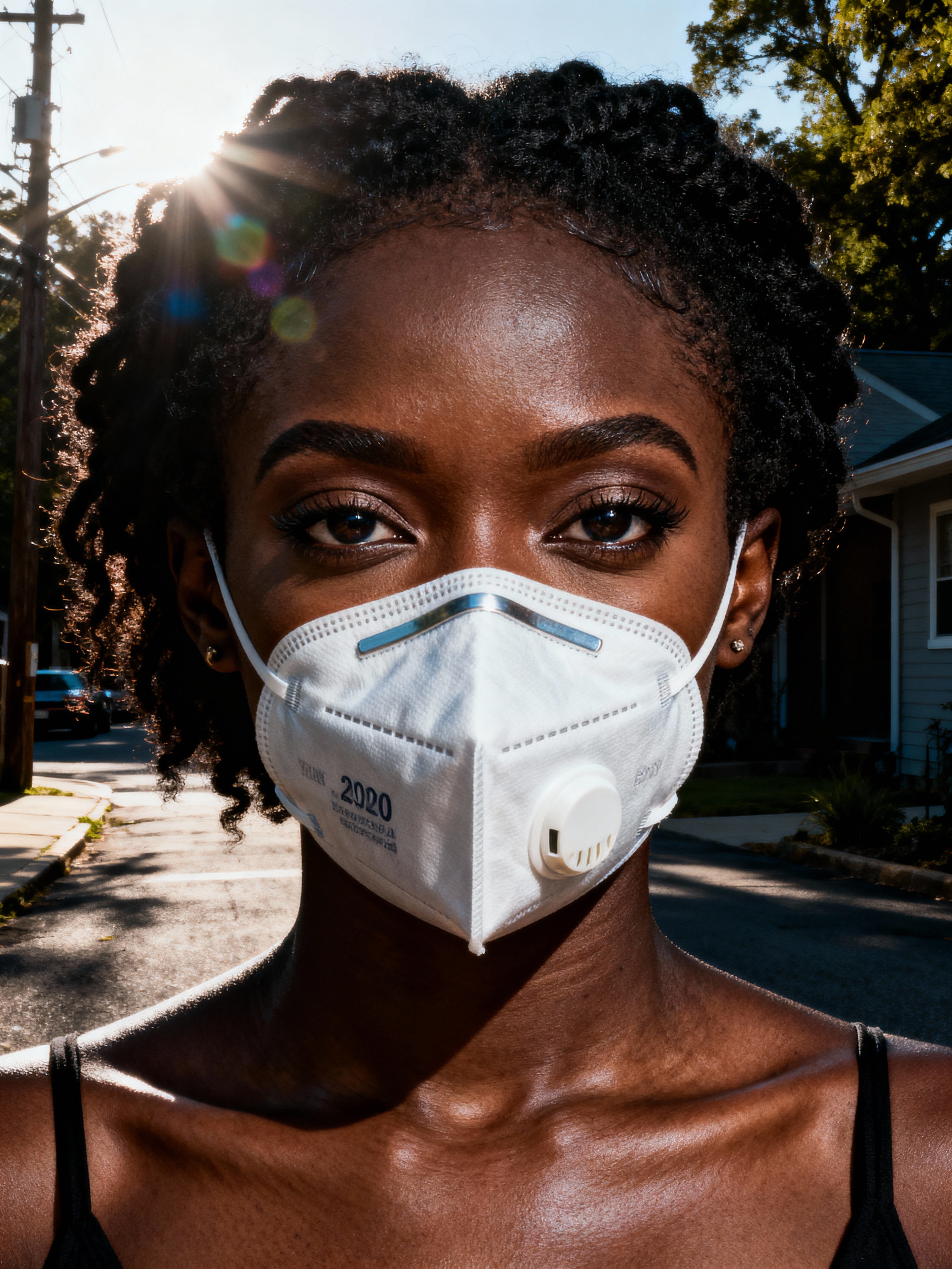 model wearing a Covid n95 mask in 2020. outside