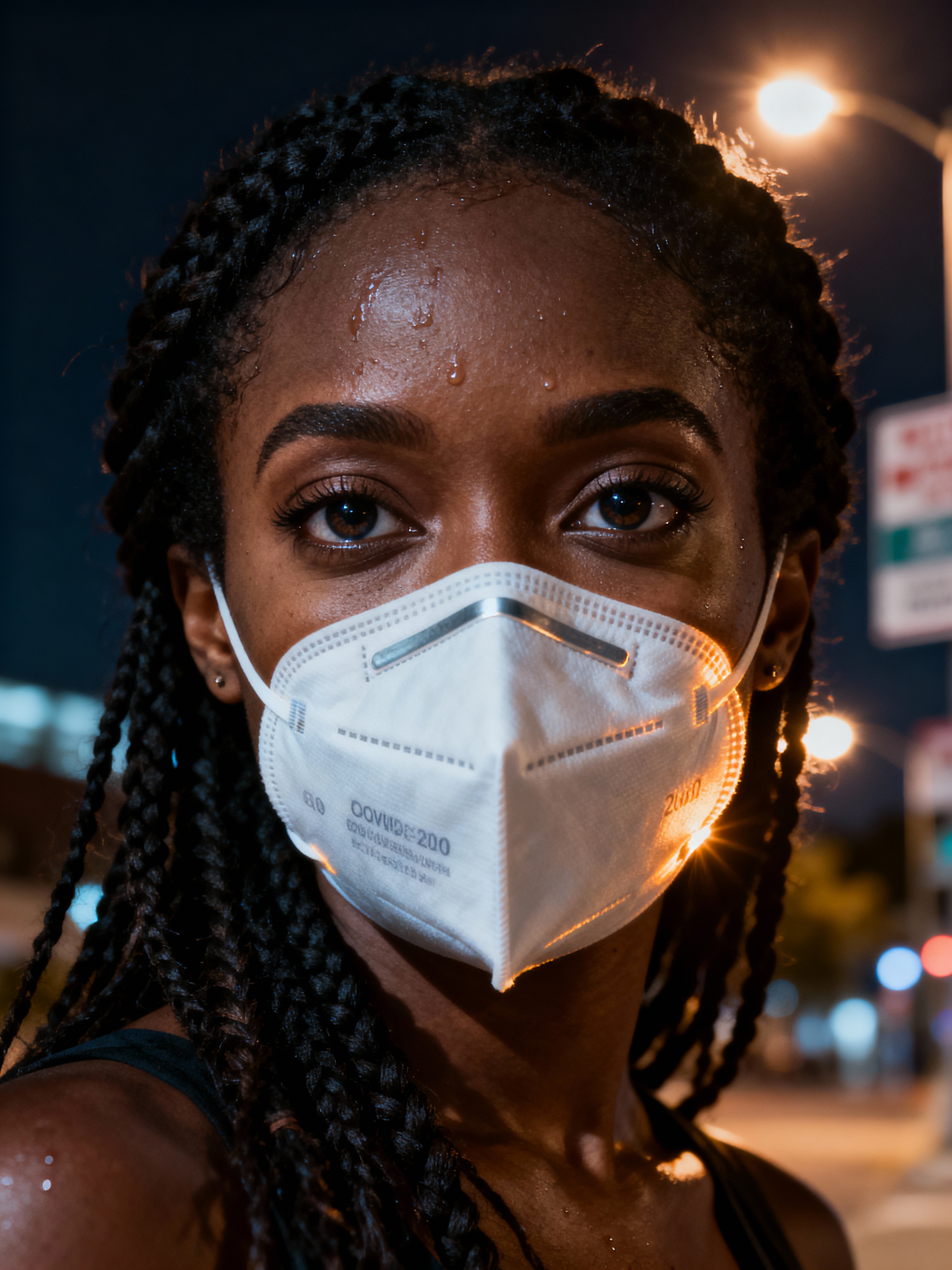 model wearing a Covid n95 mask in 2020. outside