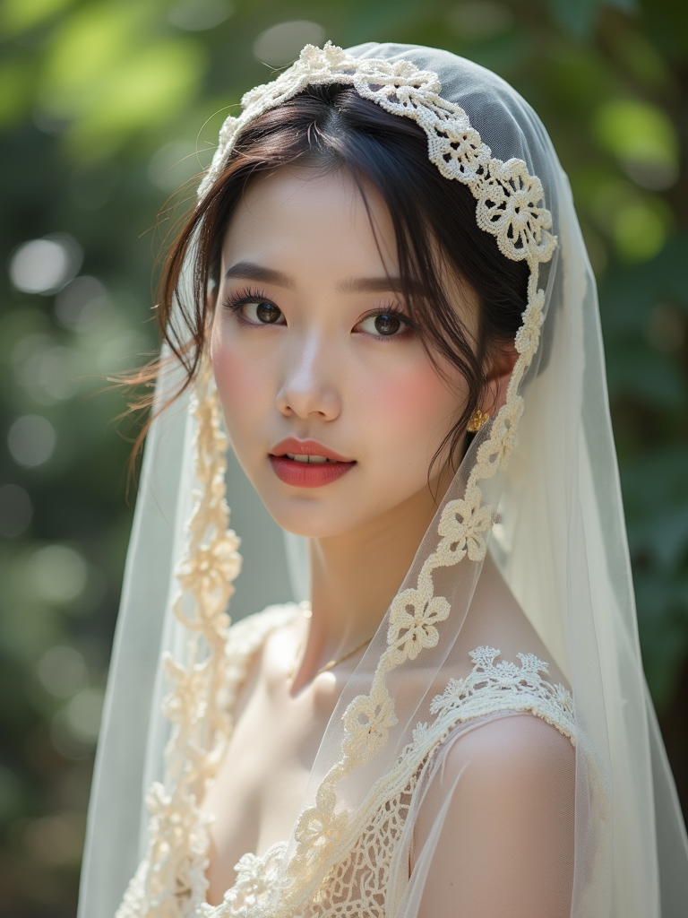 model wearing a delicate lace-trimmed head scarf covering all hair, with romantic makeup , in a charming garden setting