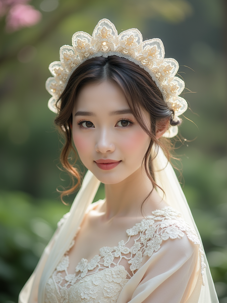 model wearing a delicate lace-trimmed head scarf covering all hair, with romantic makeup , in a charming garden setting