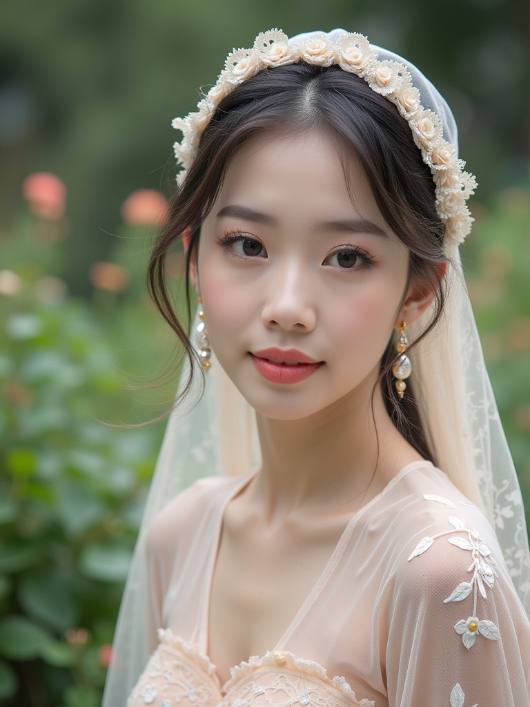 model wearing a delicate lace-trimmed head scarf covering all hair, with romantic makeup , in a charming garden setting