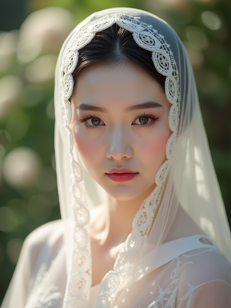 model wearing a delicate lace-trimmed head scarf covering all hair, with romantic makeup , in a charming garden setting