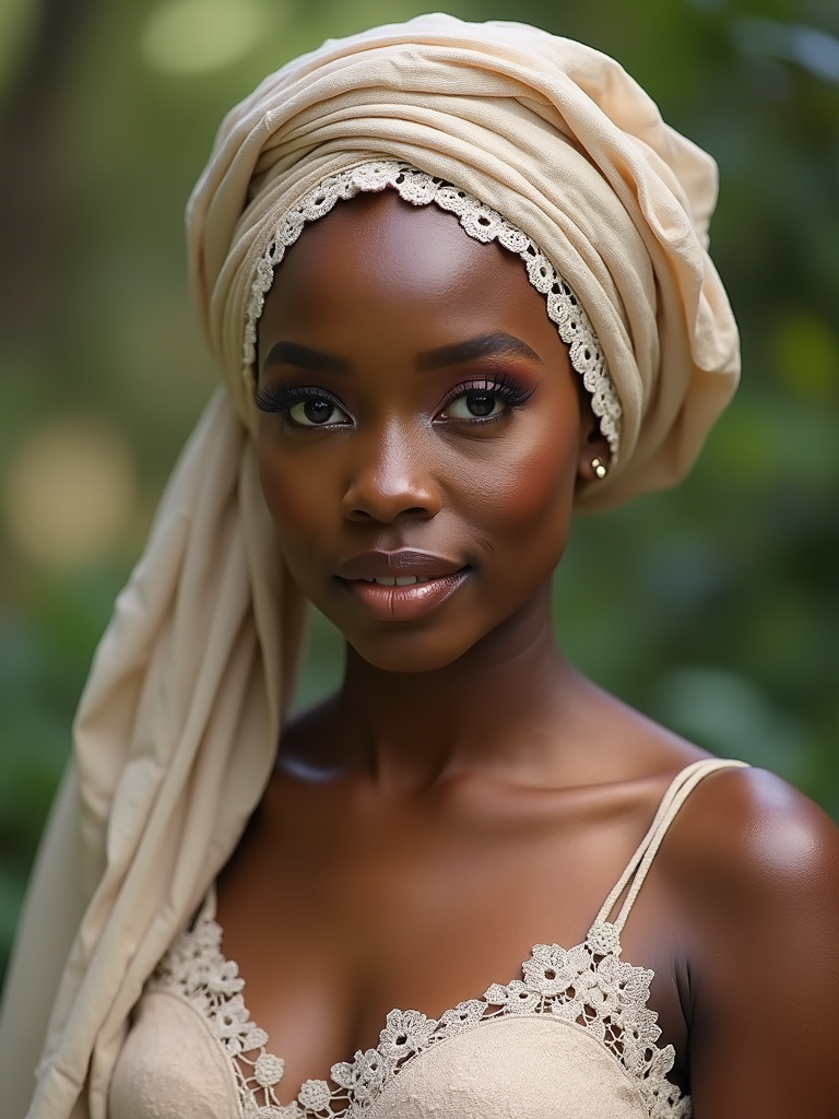 model wearing a delicate lace-trimmed head scarf covering all hair, with romantic makeup , in a charming garden setting