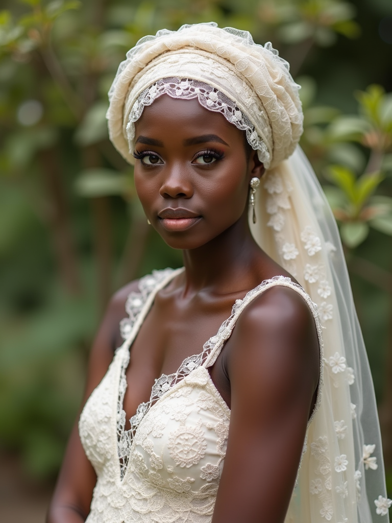 model wearing a delicate lace-trimmed head scarf covering all hair, with romantic makeup , in a charming garden setting