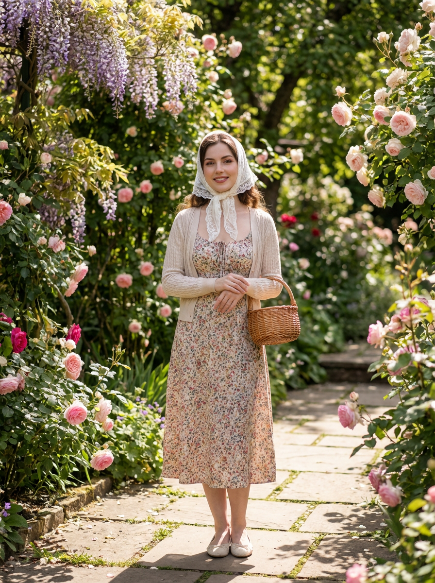 model wearing a delicate lace-trimmed head scarf covering all hair, with romantic makeup , in a charming garden setting