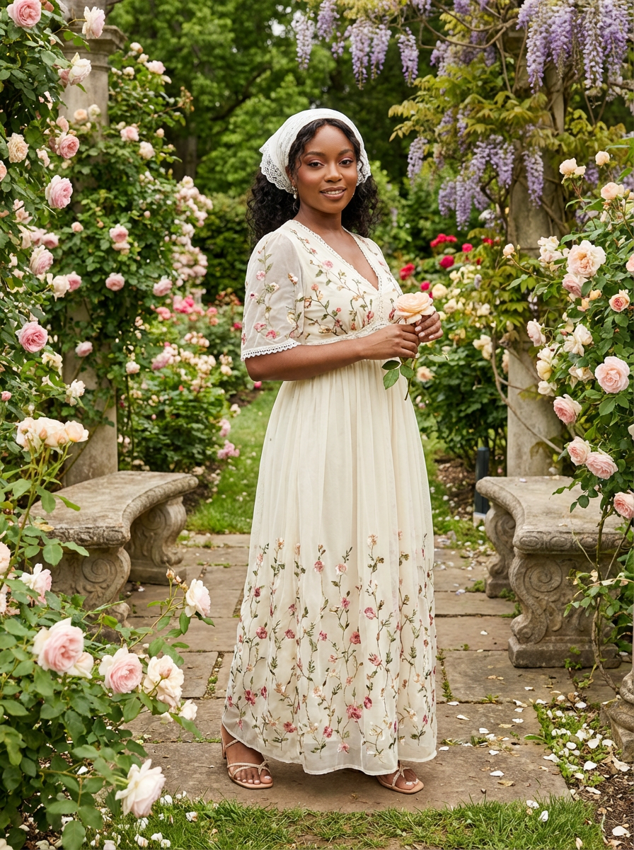 model wearing a delicate lace-trimmed head scarf covering all hair, with romantic makeup , in a charming garden setting