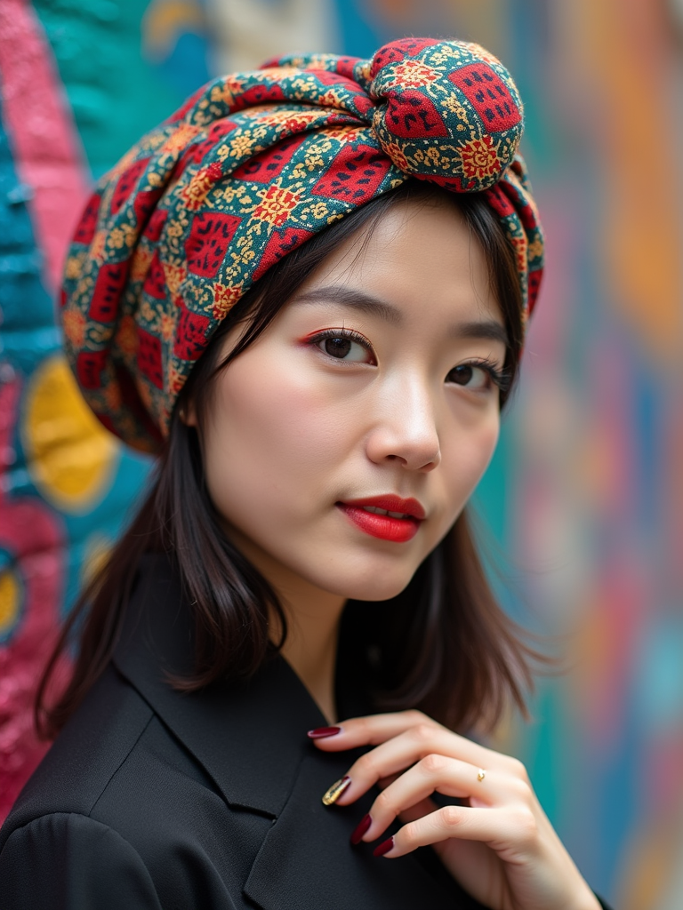 model wearing a geometric print head scarf covering all hair with decorative front knot, with bold lipstick , against a colorful street art wall