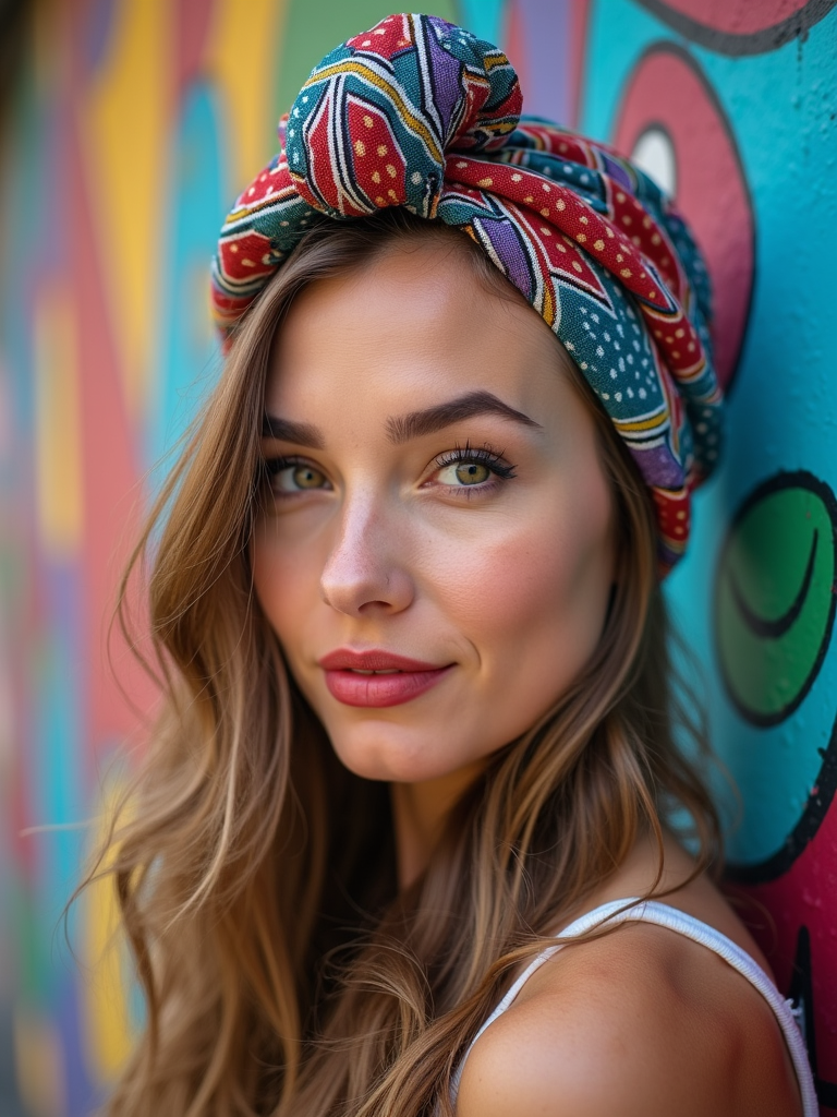 model wearing a geometric print head scarf covering all hair with decorative front knot, with bold lipstick , against a colorful street art wall