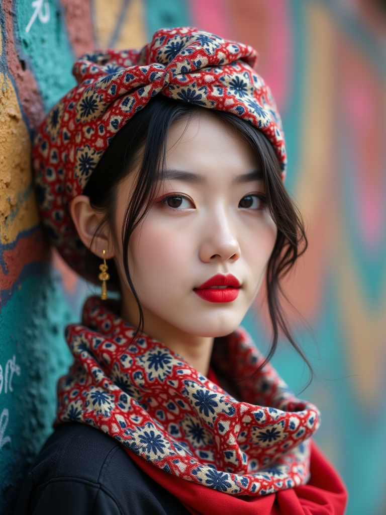 model wearing a geometric print head scarf covering all hair with decorative front knot, with bold lipstick , against a colorful street art wall