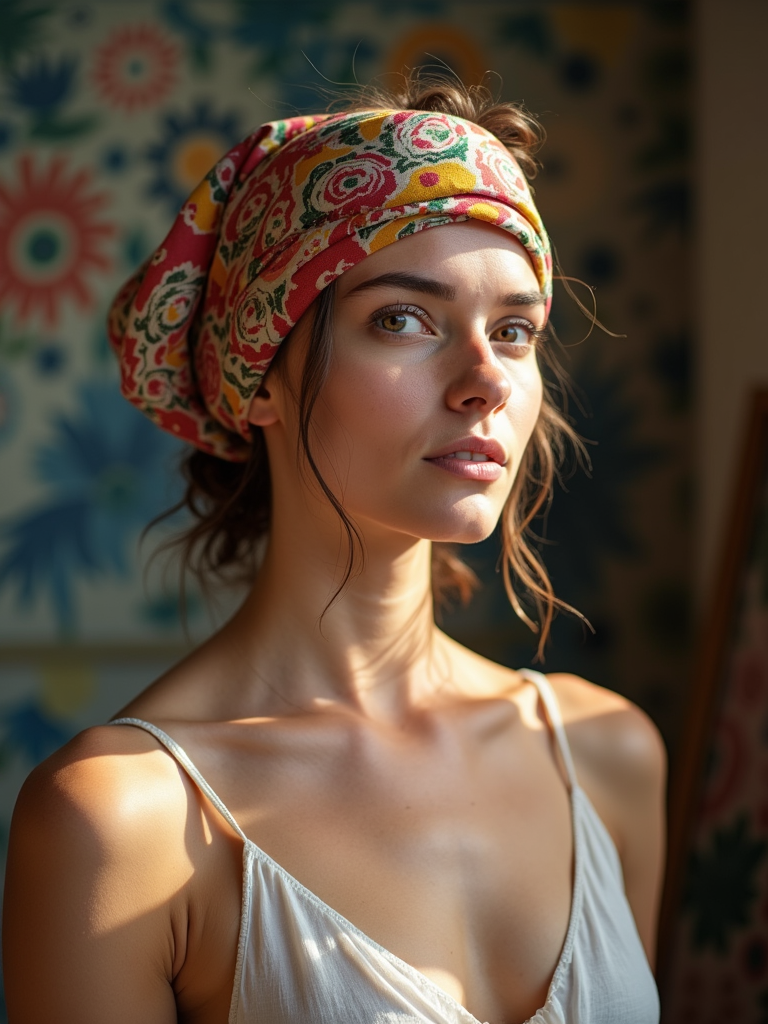 model wearing a hand-painted silk head scarf in full coverage style, with a natural glow , in an artist's studio with natural light
