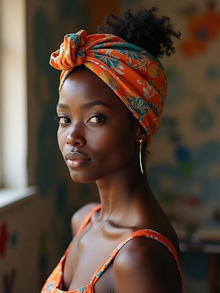 model wearing a hand-painted silk head scarf in full coverage style, with a natural glow , in an artist's studio with natural light