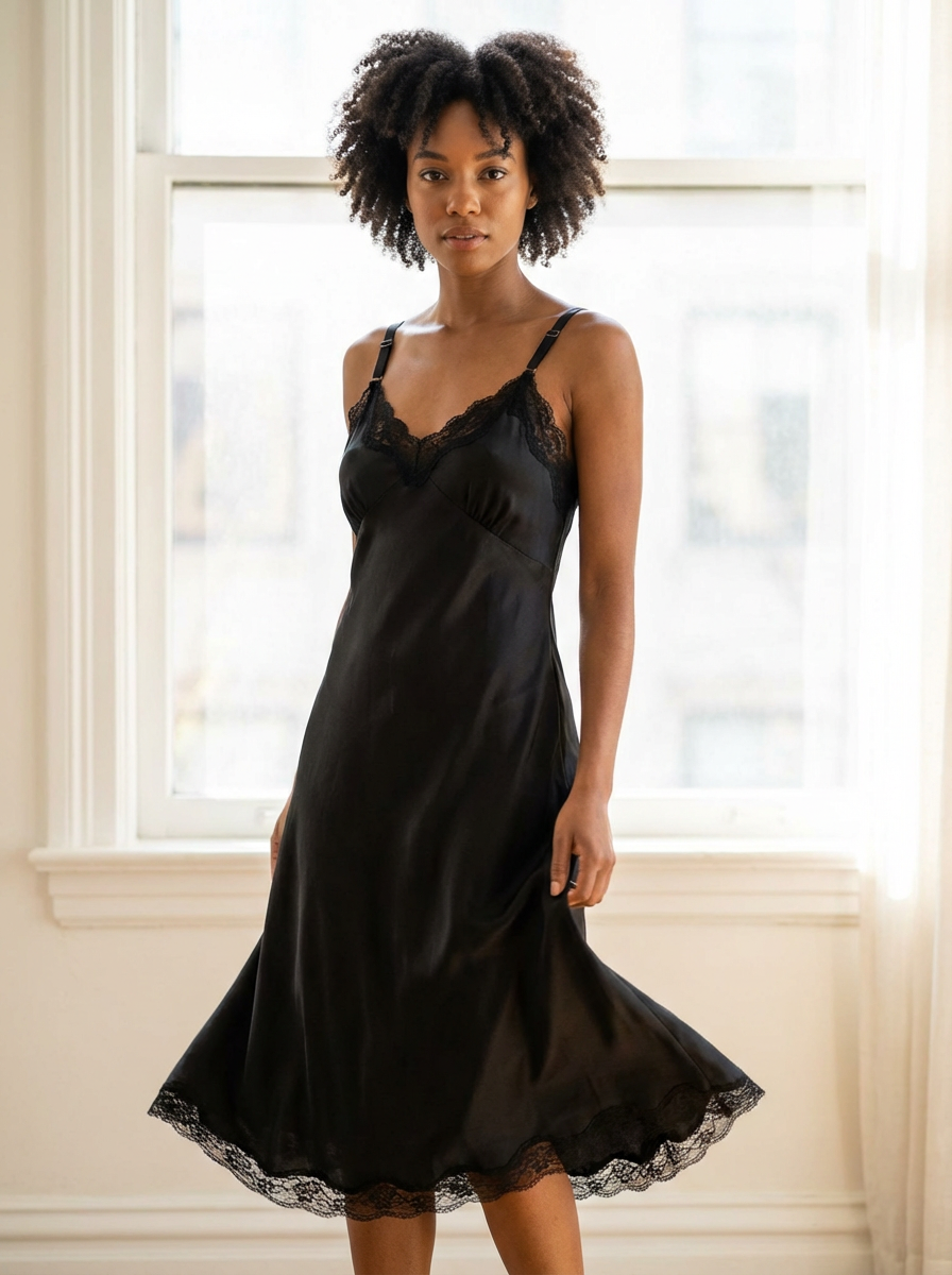 model wearing a luxury silk slip dress with lace trim, adjustable straps, and a bias-cut silhouette. the garment moves beautifully with her body. soft, natural lighting emphasizes the fabric quality