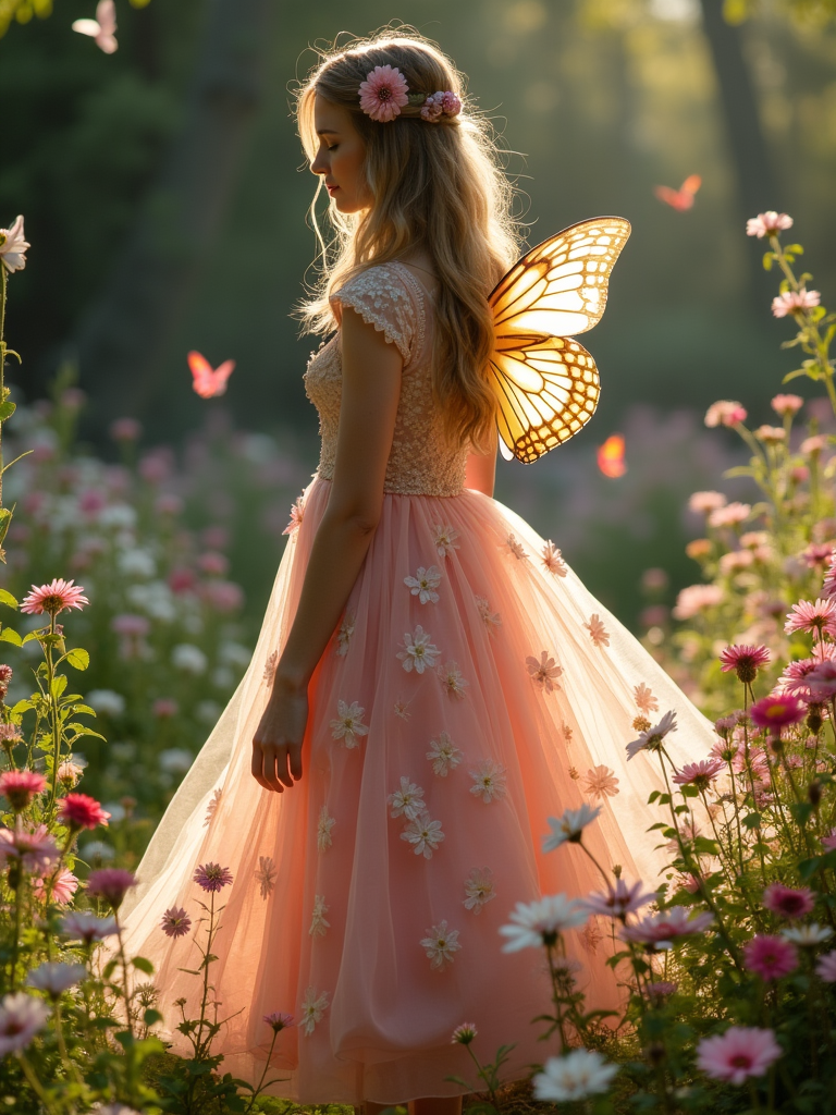model wearing a magical garden dress that blooms with real flowers in an enchanted garden where flowers glow and butterflies have rainbow wings under soft dreamy lighting