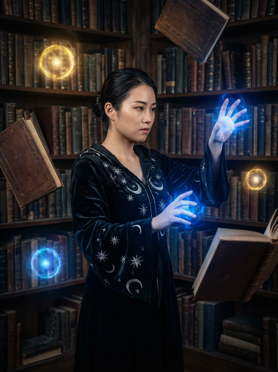 model wearing a magical sorceress robe with star patterns casting spells in an ancient magical library filled with floating books and glowing orbs