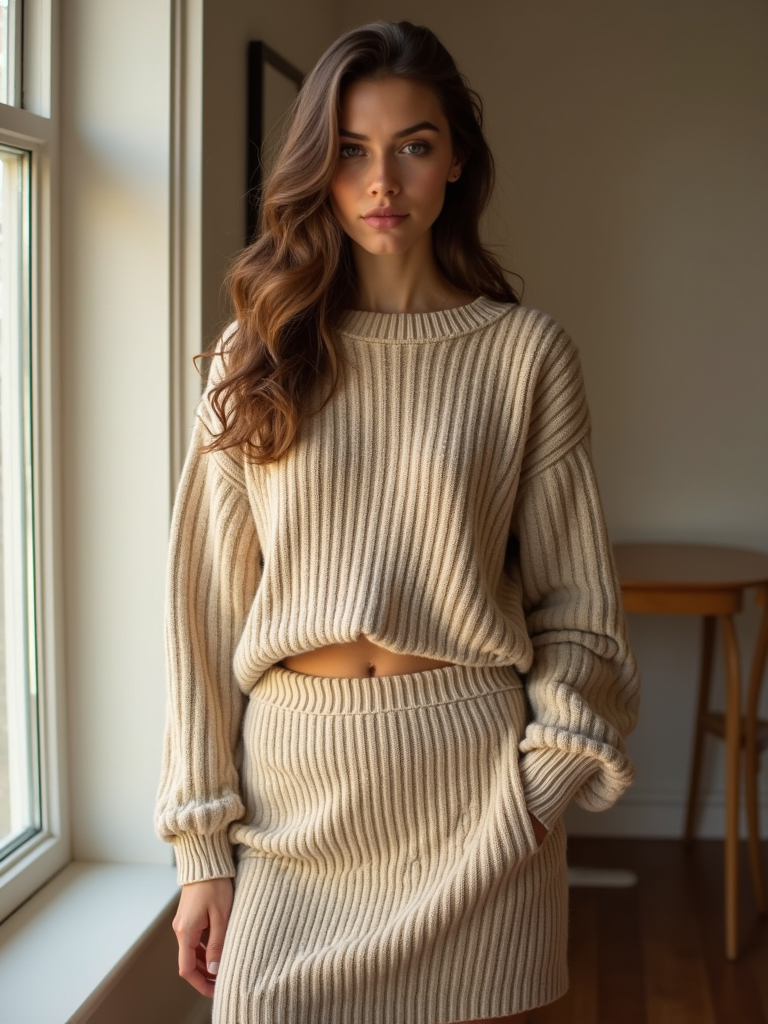 model wearing a nude-colored ribbed knit two-piece set (sweater and skirt), in a Scandinavian interior, warm natural lighting, fashion photography