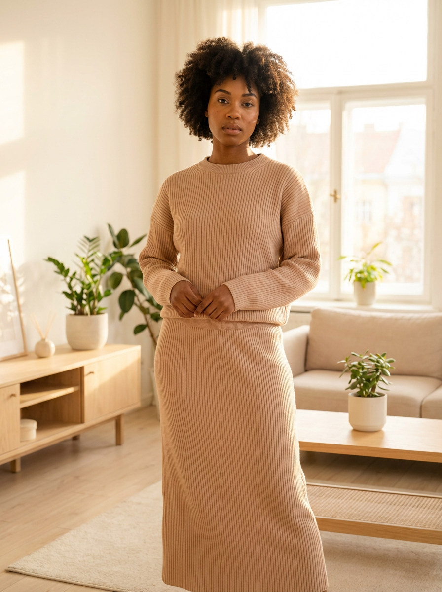 model wearing a nude-colored ribbed knit two-piece set (sweater and skirt), in a Scandinavian interior, warm natural lighting, fashion photography