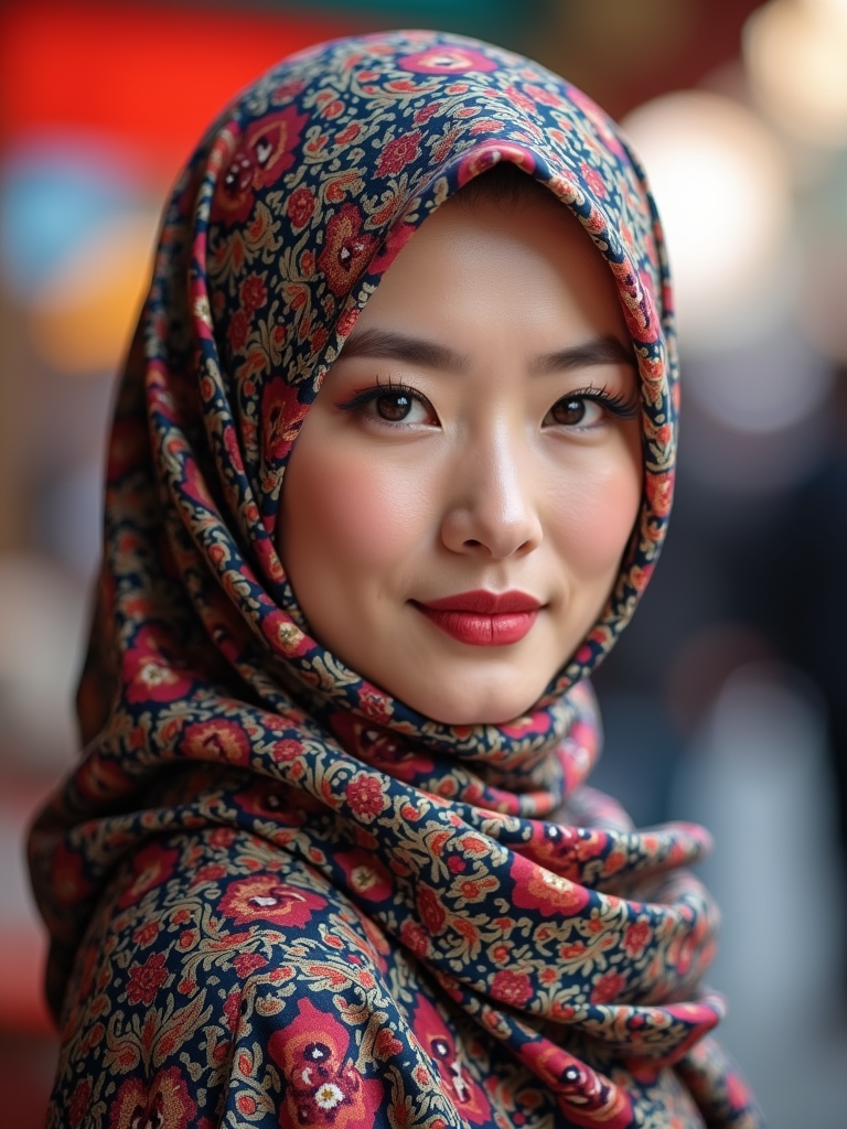 model wearing a paisley print head scarf in a full coverage style, with winged eyeliner , at an outdoor market