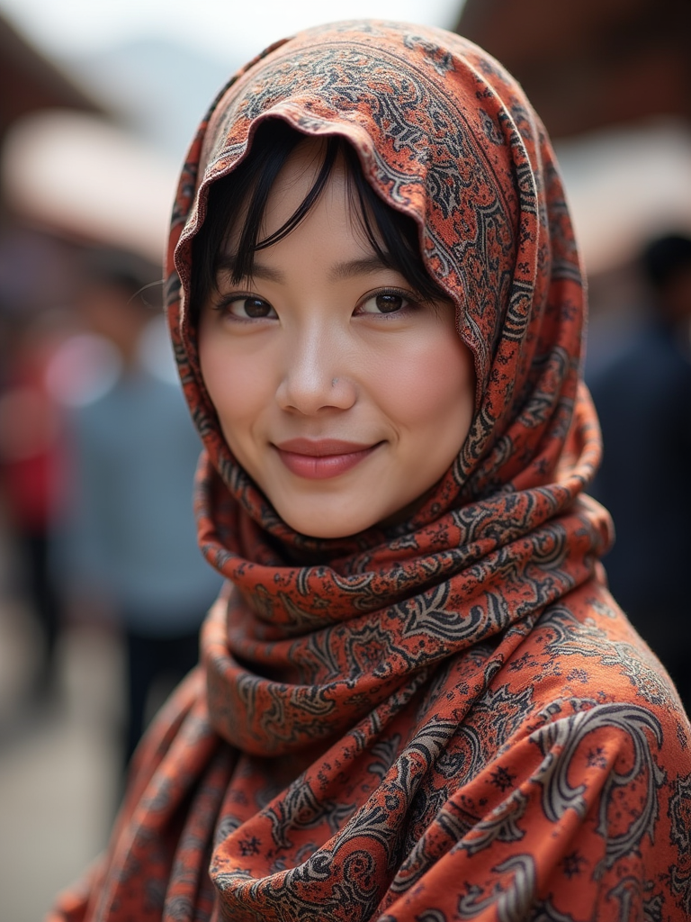 model wearing a paisley print head scarf in a full coverage style, with winged eyeliner , at an outdoor market