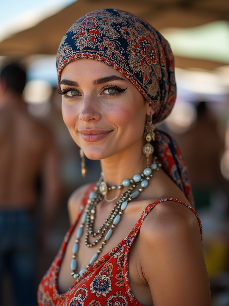 model wearing a paisley print head scarf in a full coverage style, with winged eyeliner , at an outdoor market