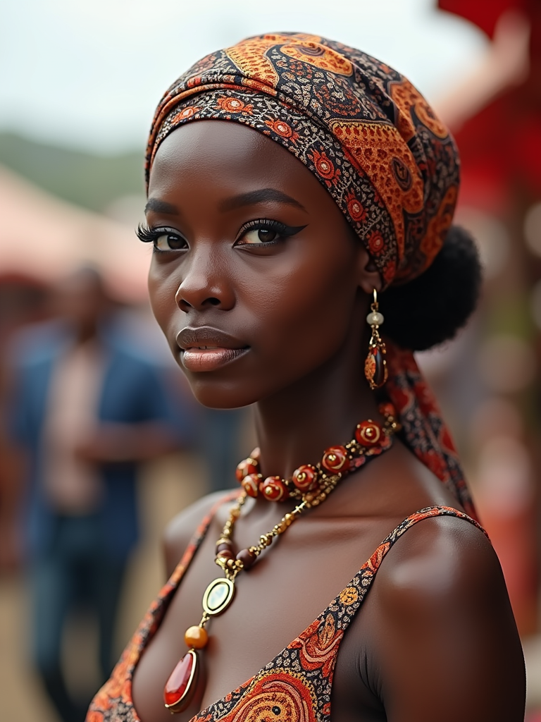 model wearing a paisley print head scarf in a full coverage style, with winged eyeliner , at an outdoor market