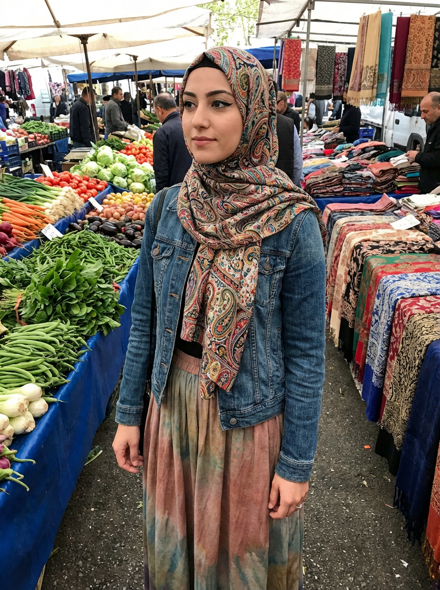 model wearing a paisley print head scarf in a full coverage style, with winged eyeliner , at an outdoor market