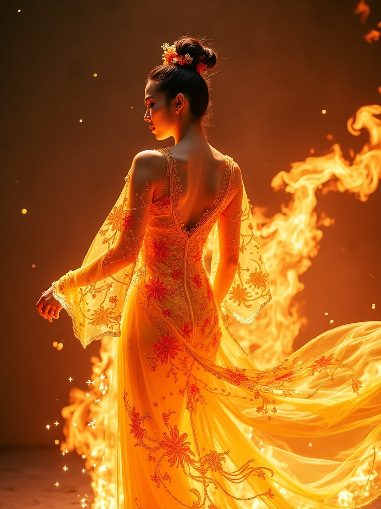 model wearing a phoenix-inspired gown with flame patterns surrounded by magical fire that doesn't burn, creating warm golden and orange magical lighting