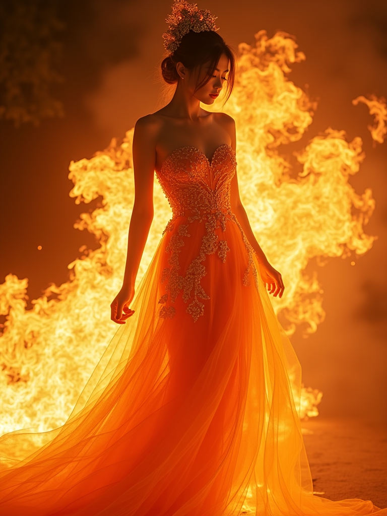 model wearing a phoenix-inspired gown with flame patterns surrounded by magical fire that doesn't burn, creating warm golden and orange magical lighting