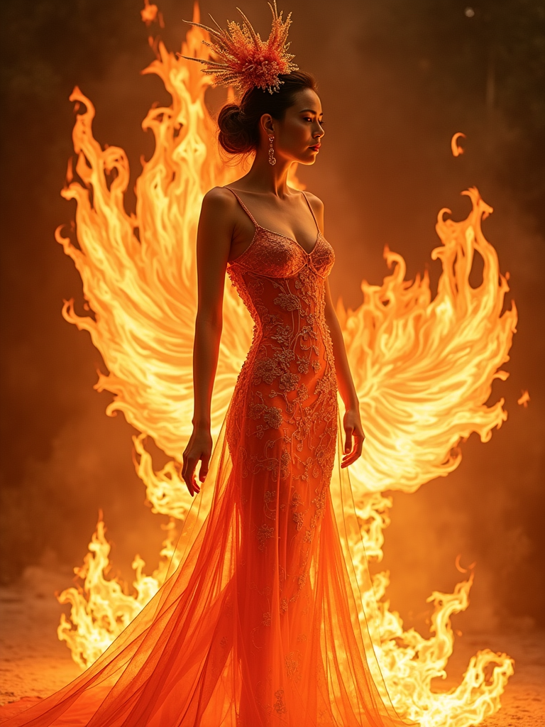 model wearing a phoenix-inspired gown with flame patterns surrounded by magical fire that doesn't burn, creating warm golden and orange magical lighting