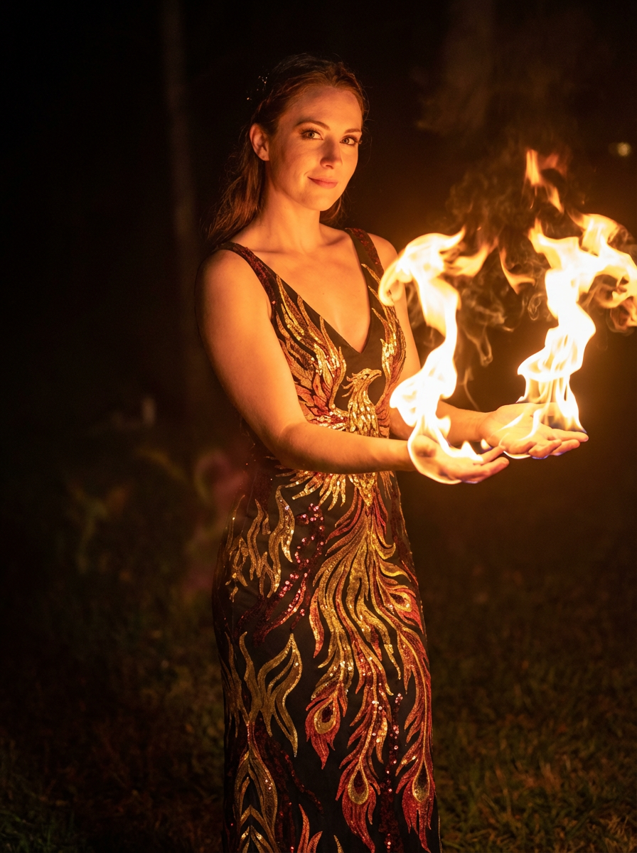 model wearing a phoenix-inspired gown with flame patterns surrounded by magical fire that doesn't burn, creating warm golden and orange magical lighting