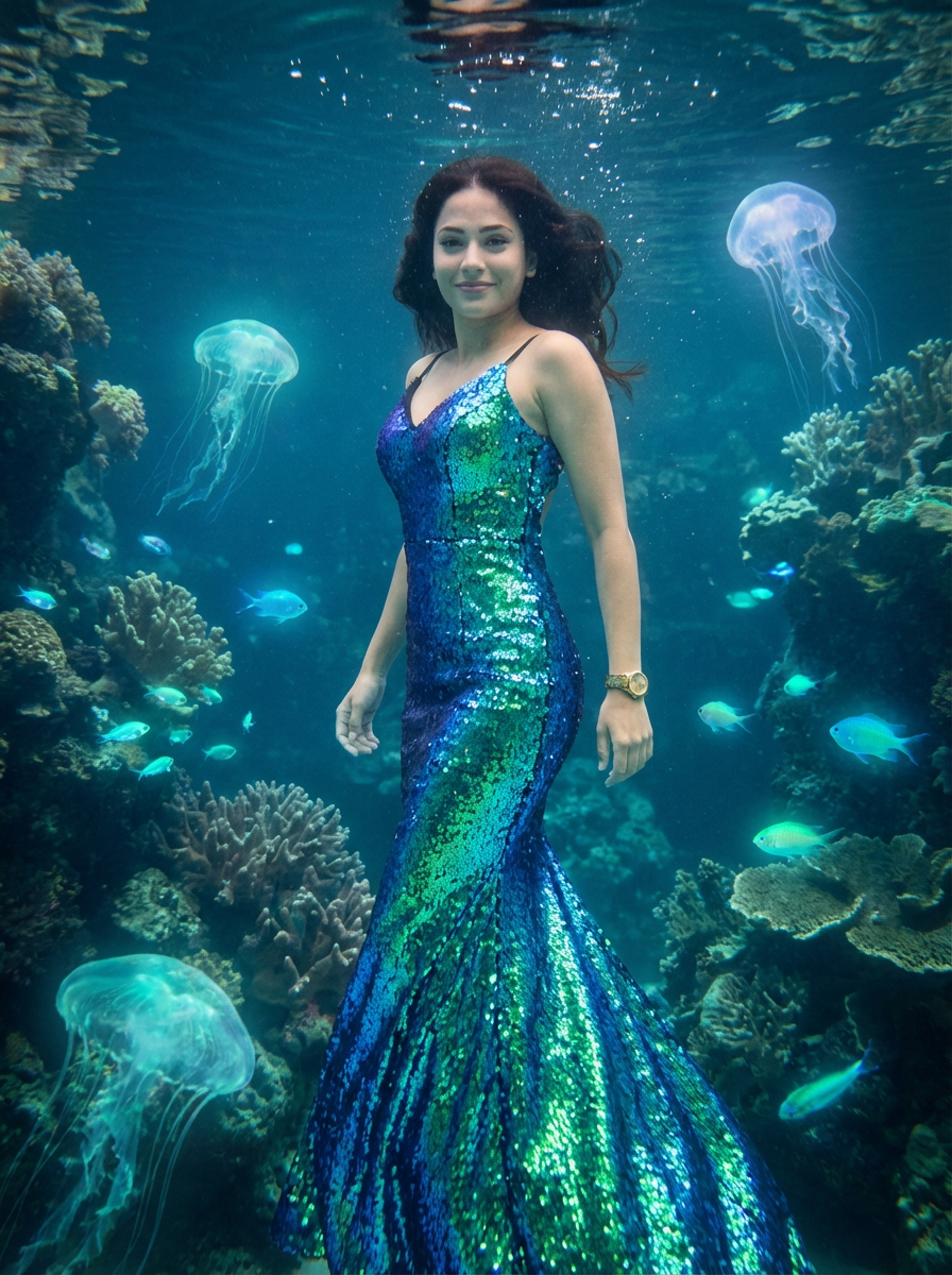 model wearing a shimmering mermaid-style gown with iridescent scales in an underwater fairy palace with coral formations and bioluminescent sea creatures creating magical blue-green lighting