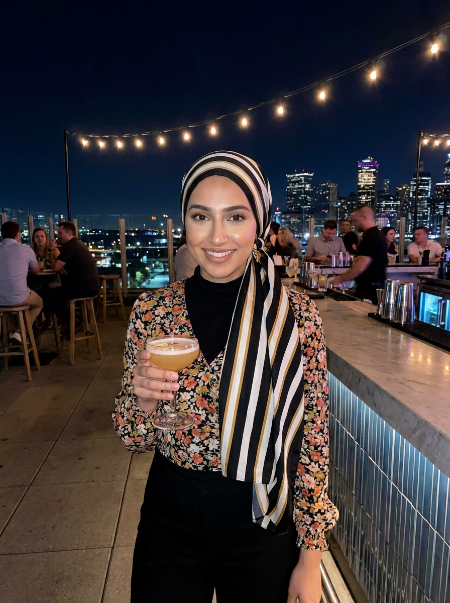 model wearing a striped head scarf in a full coverage style with side drape, with subtle highlighter , at a trendy rooftop bar