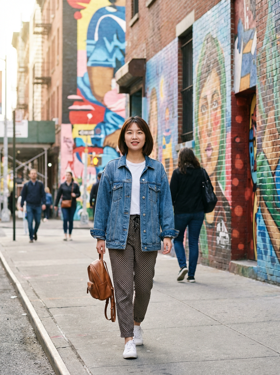 model wearing a trendy outfit, walking down a street lined with colorful murals