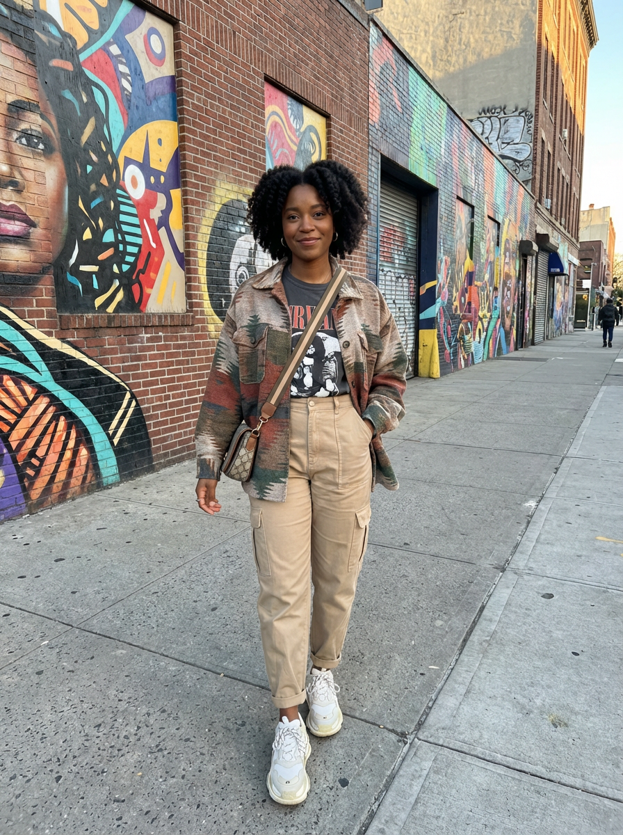 model wearing a trendy outfit, walking down a street lined with colorful murals
