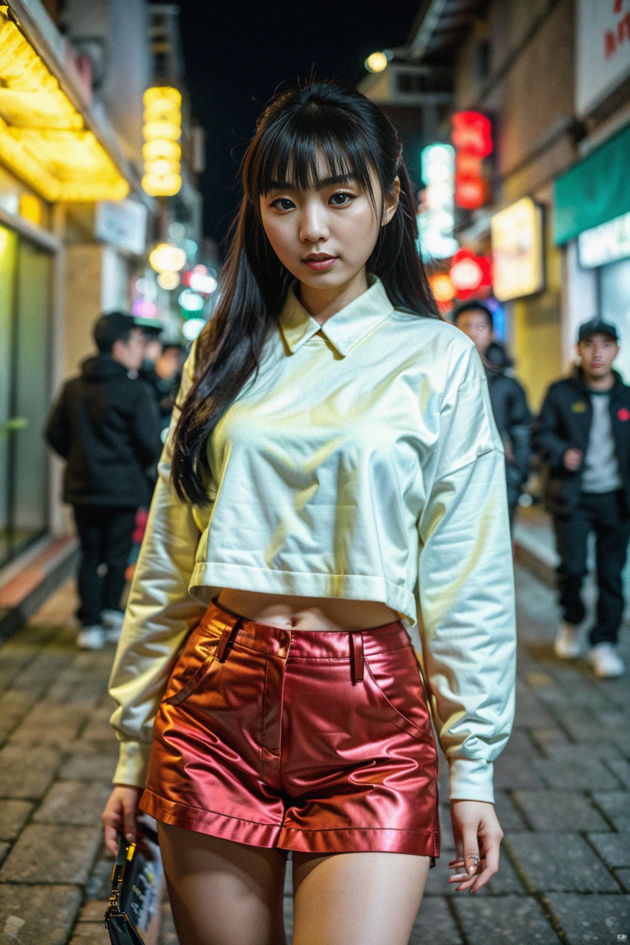 model wearing a trendy outfit, walking down a street lined with colorful murals