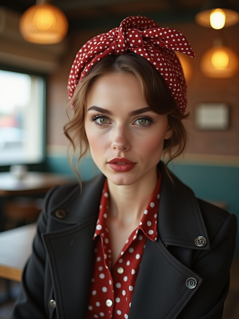 model wearing a vintage-inspired polka dot head scarf completely covering the hair, with retro makeup , at a stylish café with soft lighting