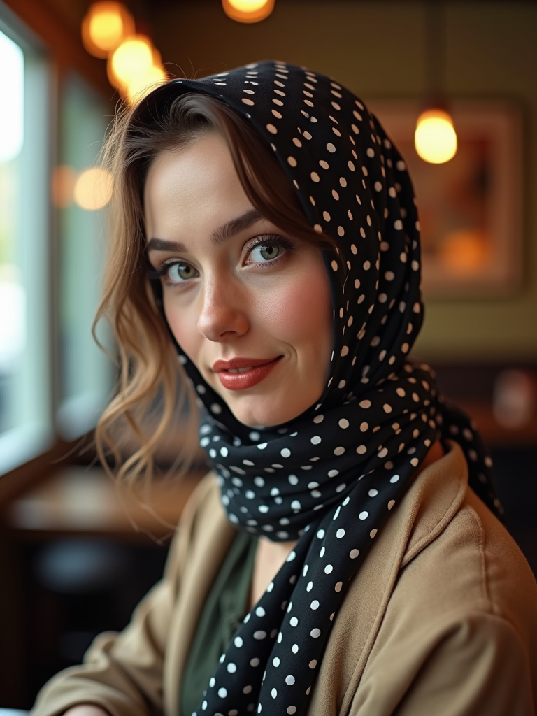 model wearing a vintage-inspired polka dot head scarf completely covering the hair, with retro makeup , at a stylish café with soft lighting