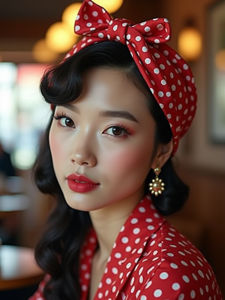 model wearing a vintage-inspired polka dot head scarf completely covering the hair, with retro makeup , at a stylish café with soft lighting