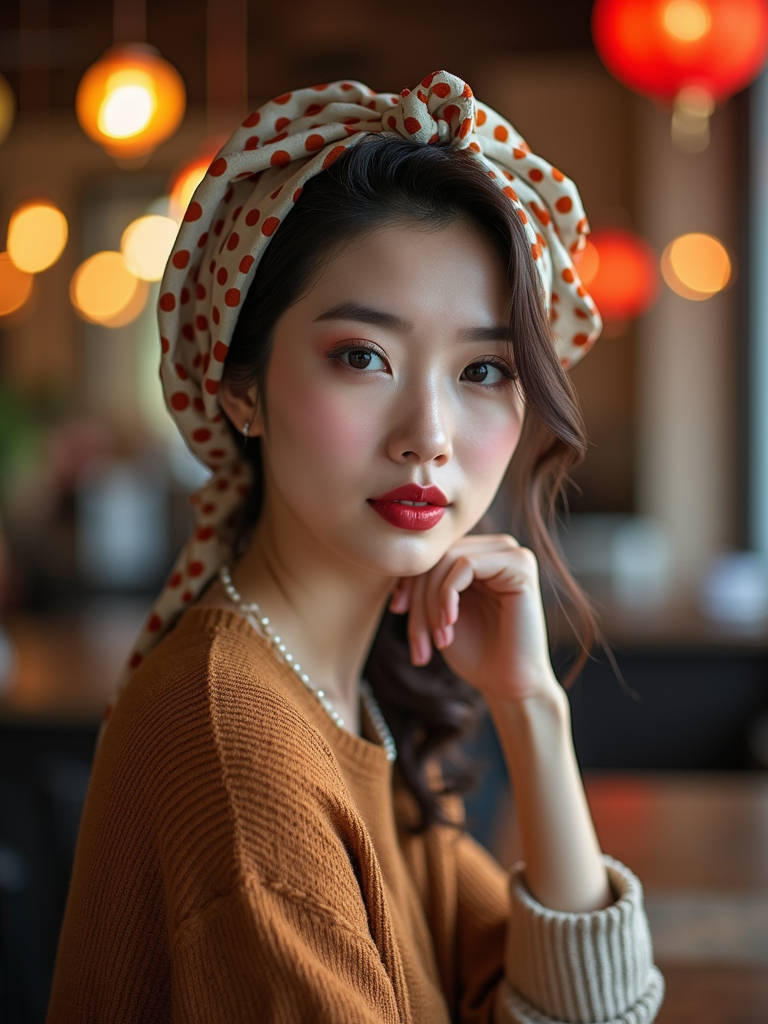 model wearing a vintage-inspired polka dot head scarf completely covering the hair, with retro makeup , at a stylish café with soft lighting