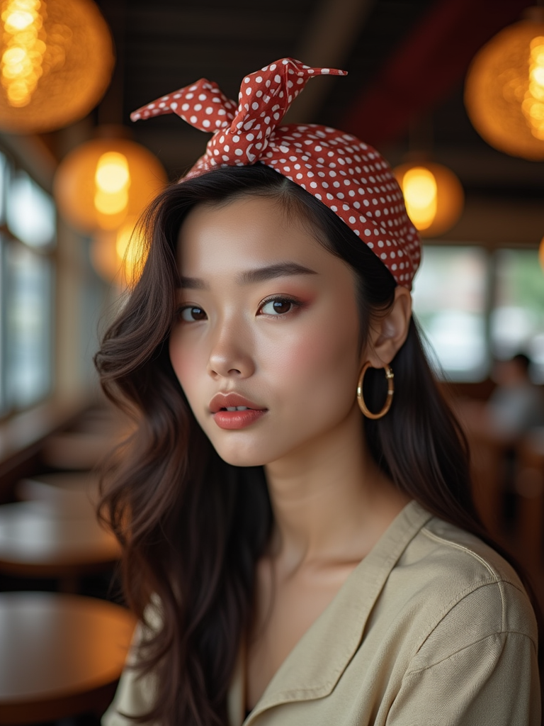 model wearing a vintage-inspired polka dot head scarf completely covering the hair, with retro makeup , at a stylish café with soft lighting