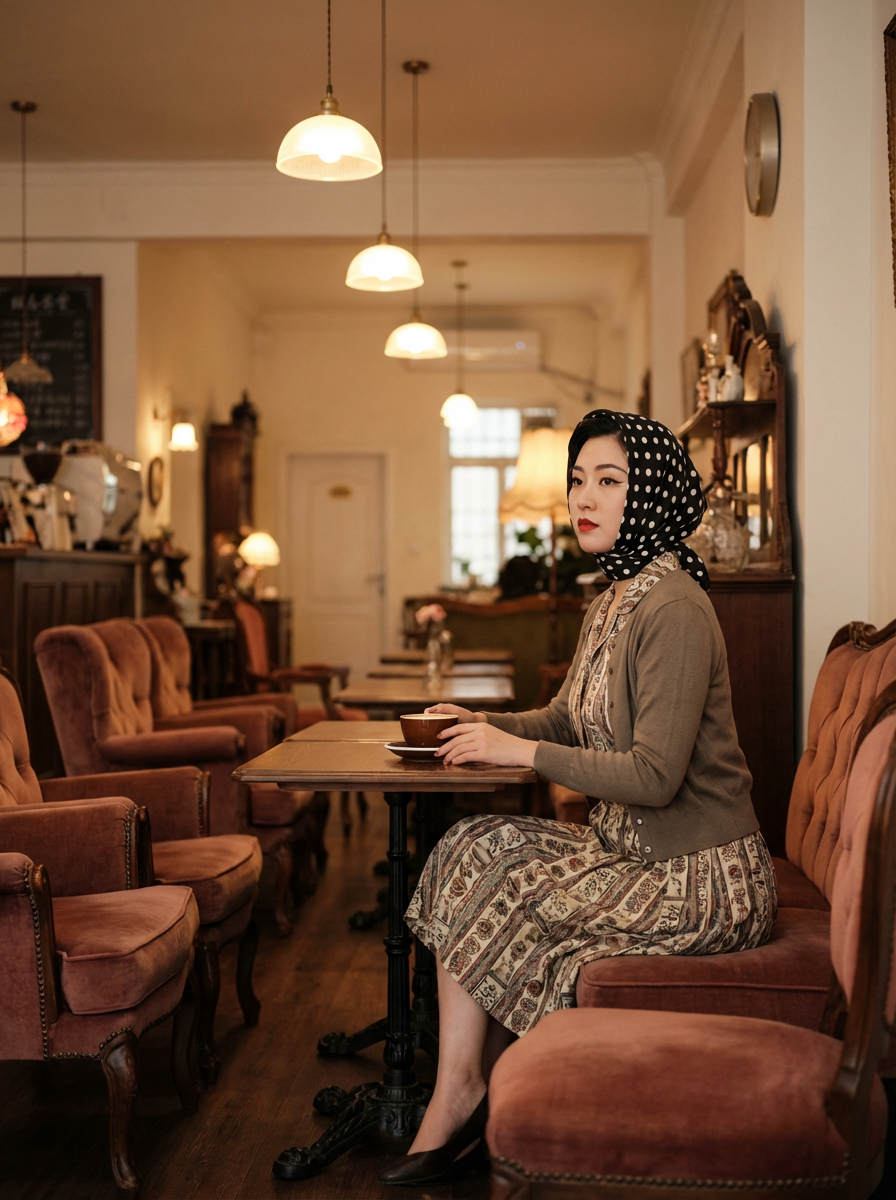 model wearing a vintage-inspired polka dot head scarf completely covering the hair, with retro makeup , at a stylish café with soft lighting