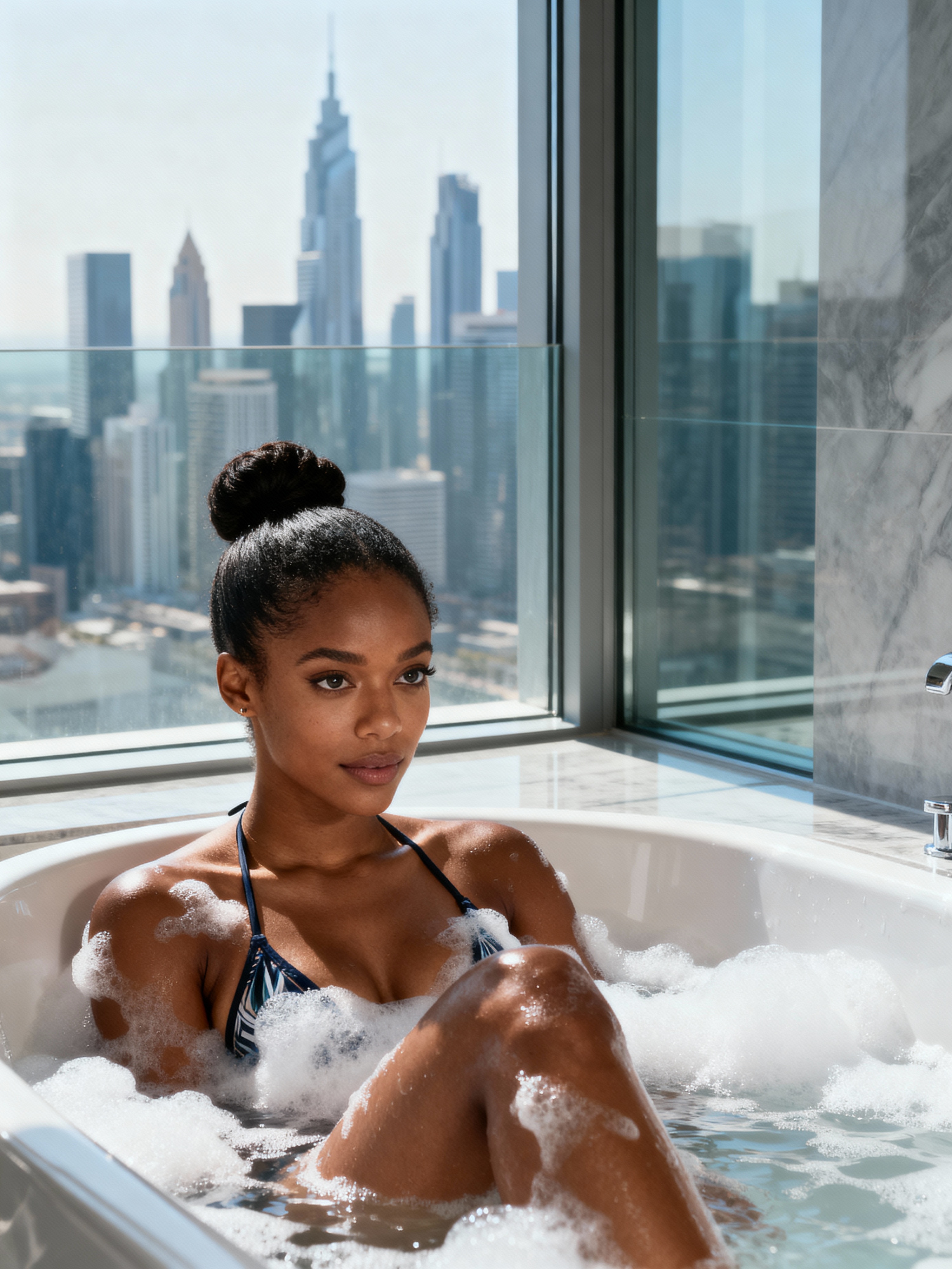 model wearing bikini sitting in a luxurious bathtub filled with bubbles, overlooking a modern city skyline through a large glass window. The model has their hair styled neatly in a bun , with the urban skyscrapers creating a striking backdrop. The atmosphere is serene, featuring soft daylight filtering through the window, emphasizing a sense of calm and exclusivity.
