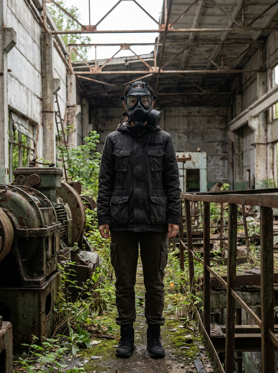 model wearing black gas mask in abandoned rusty Chernobyl.