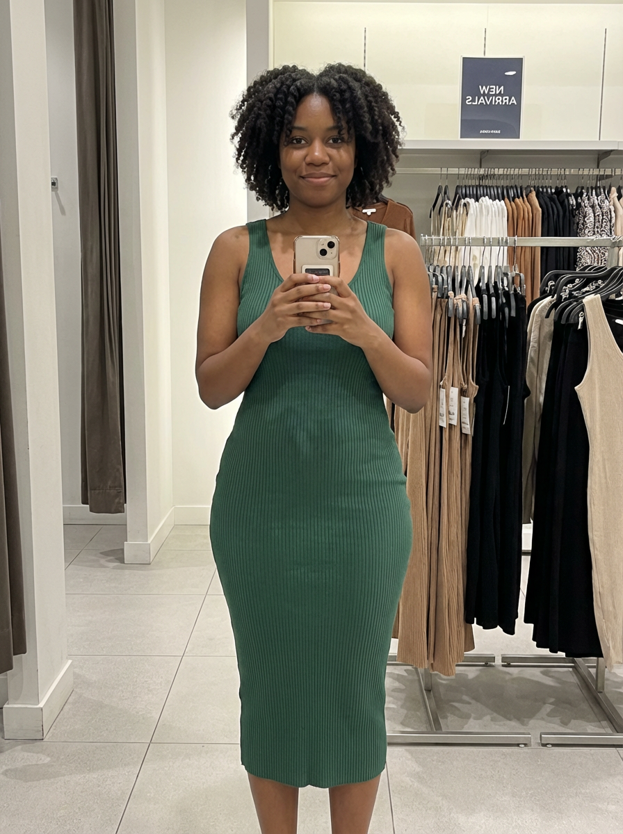 model wearing bodycon dress in try on fashion shoot for Fast fashion brand
