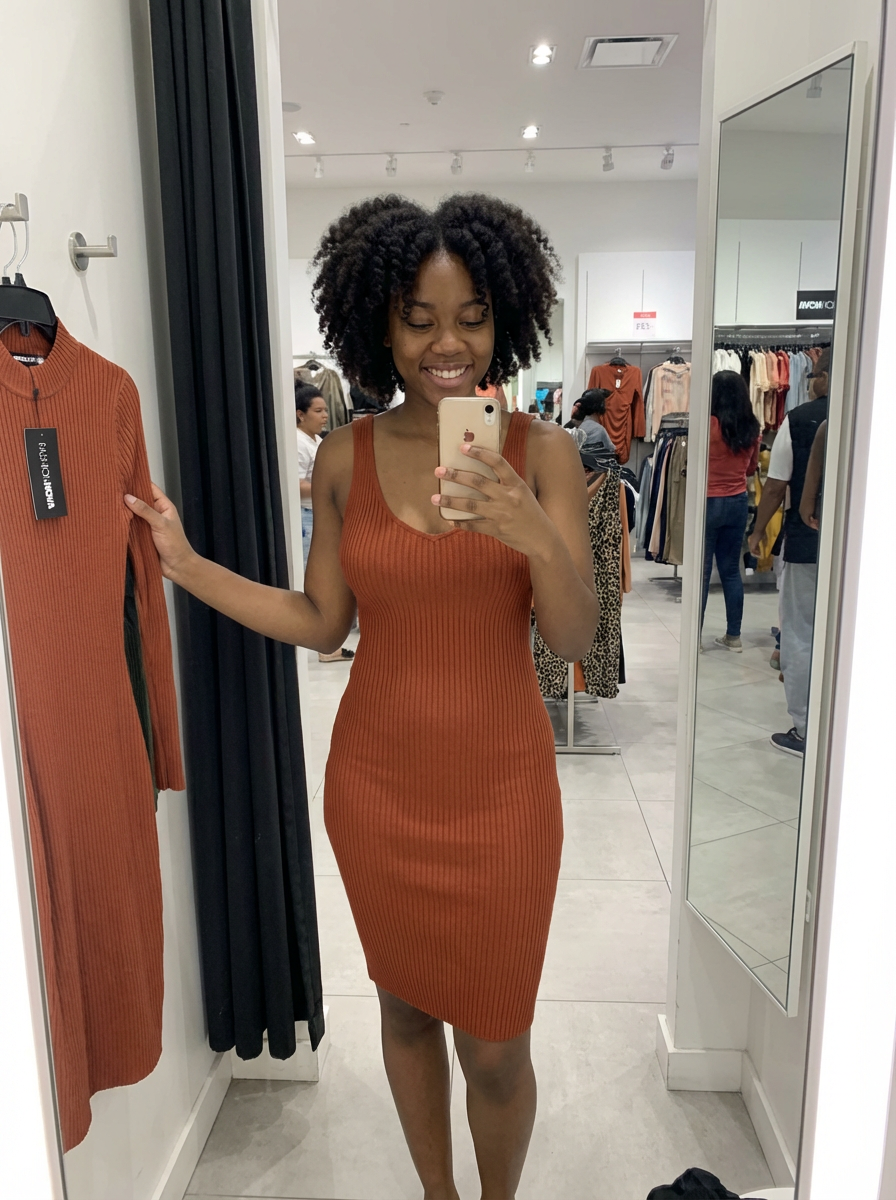 model wearing bodycon dress in try on fashion shoot for Fast fashion brand