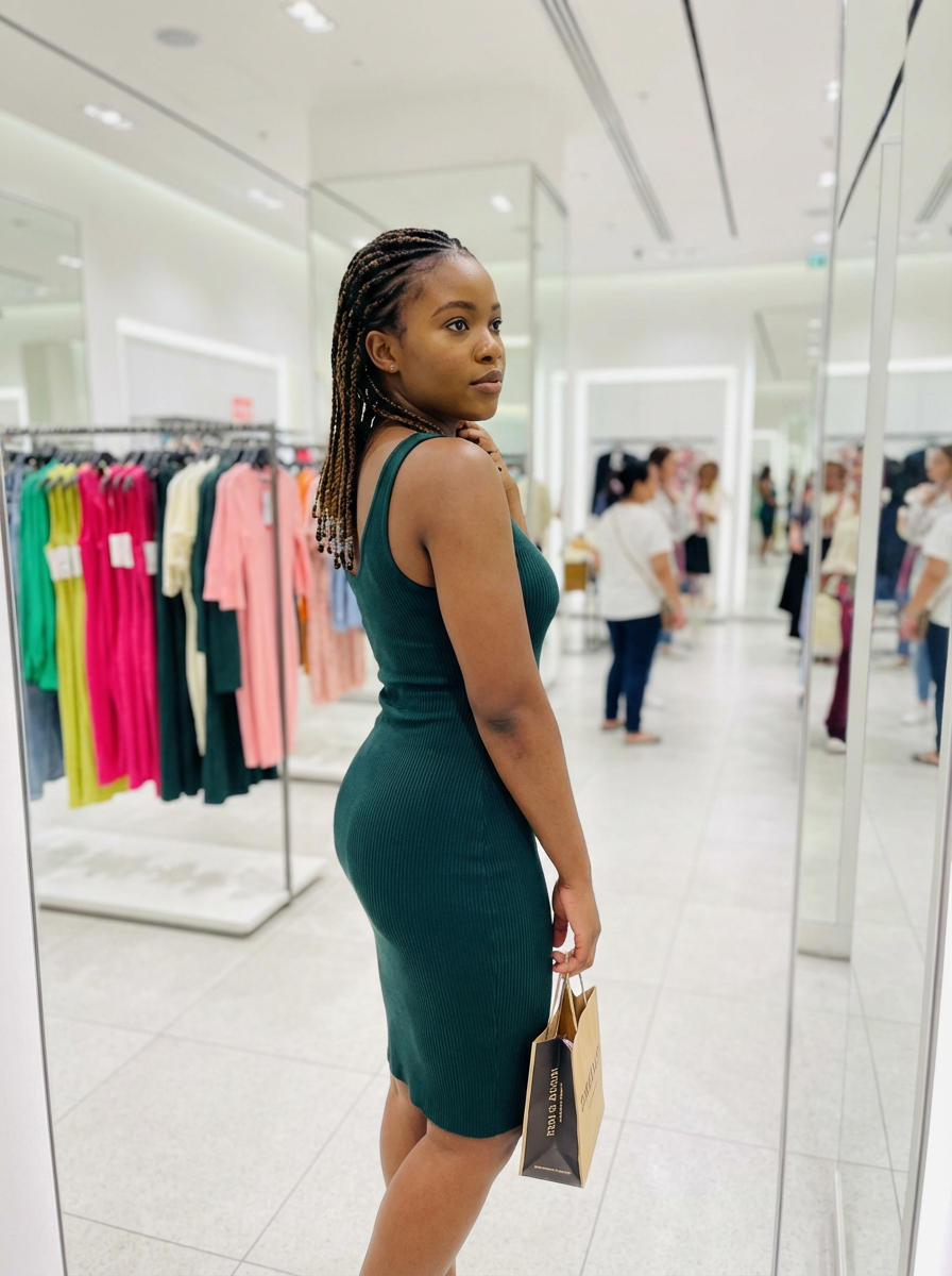 model wearing bodycon dress in try on fashion shoot for Fast fashion brand
