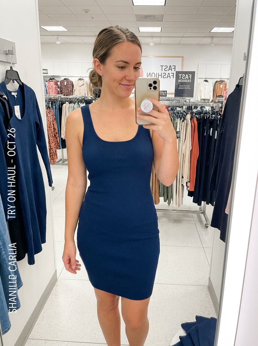 model wearing bodycon dress in try on fashion shoot for Fast fashion brand