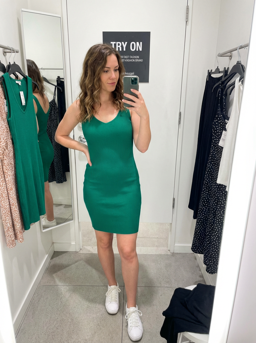 model wearing bodycon dress in try on fashion shoot for Fast fashion brand
