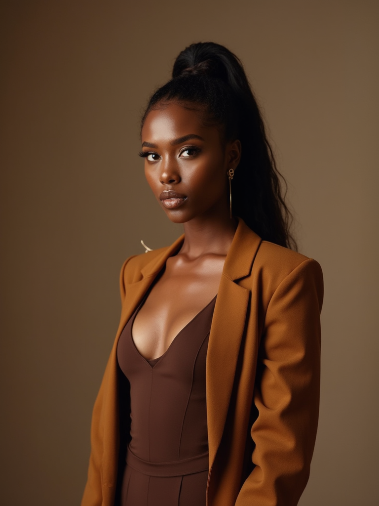 model wearing chocolate brown bodysuit with caramel blazer , monochromatic brown styling, luxurious textures, professional lighting