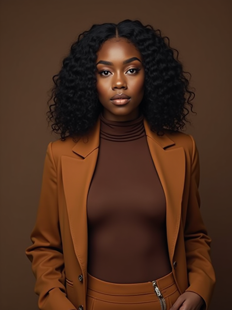 model wearing chocolate brown bodysuit with caramel blazer , monochromatic brown styling, luxurious textures, professional lighting